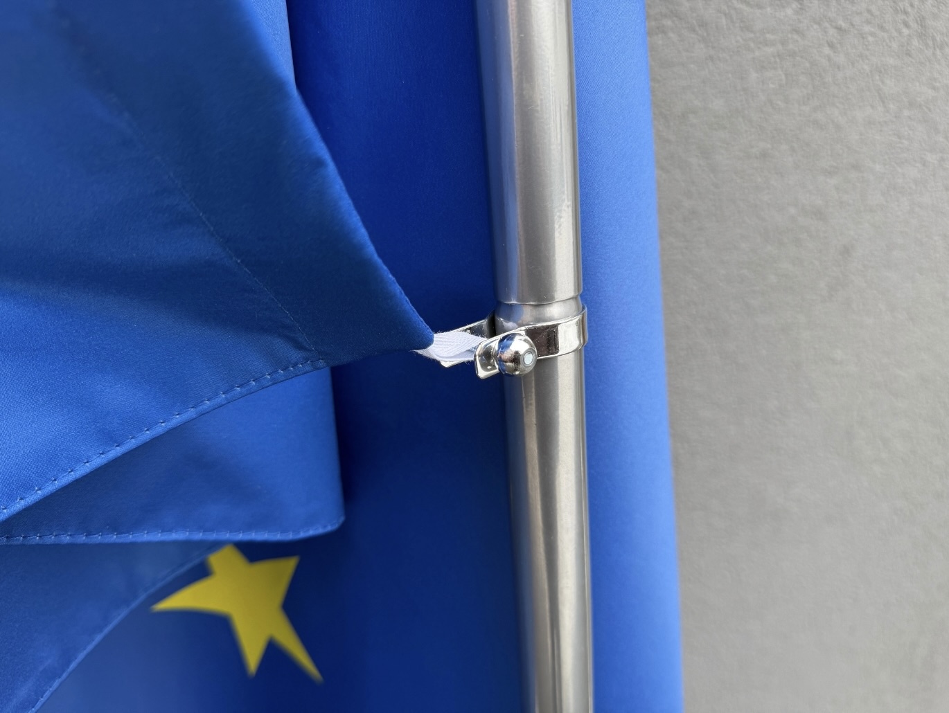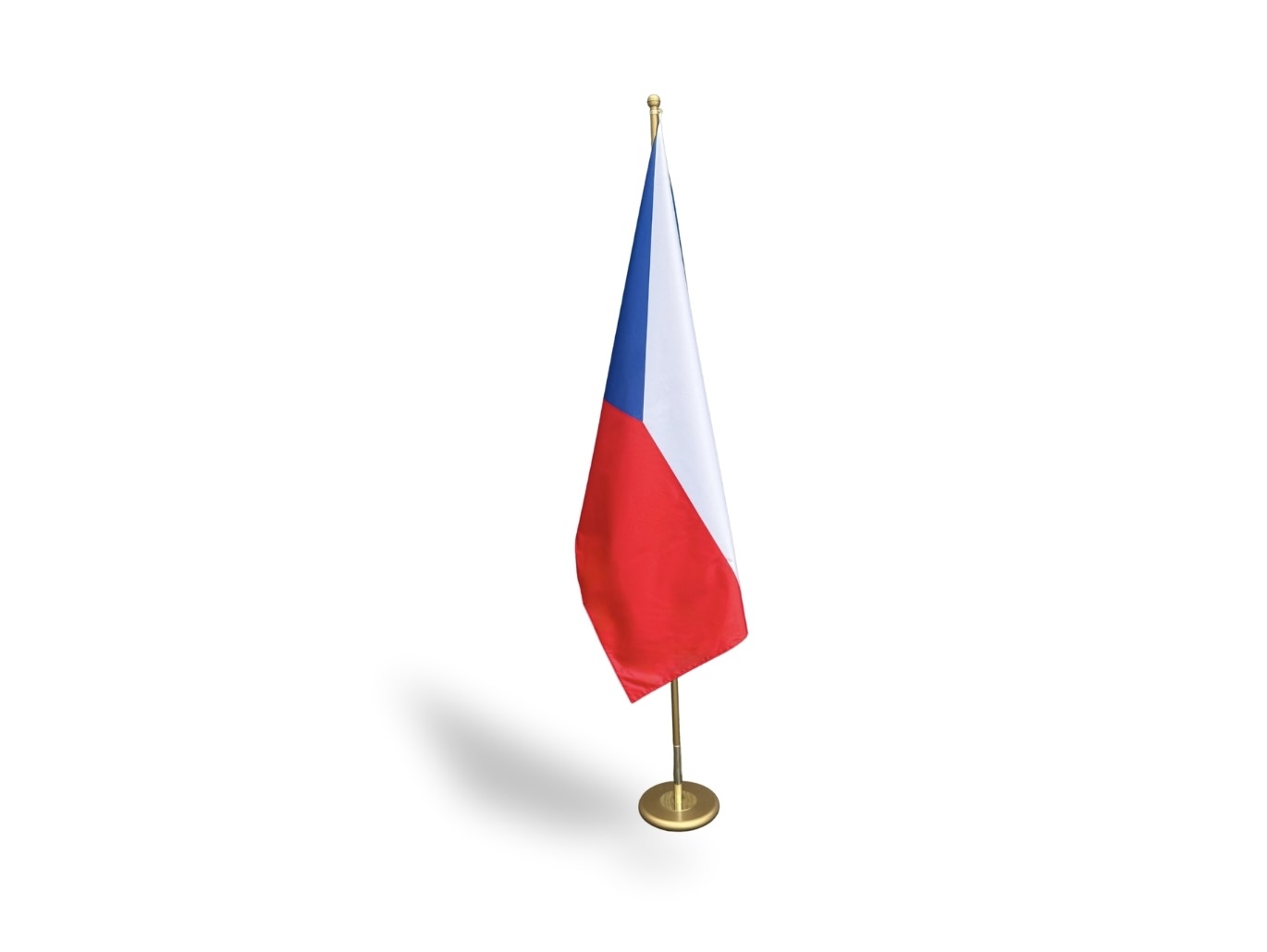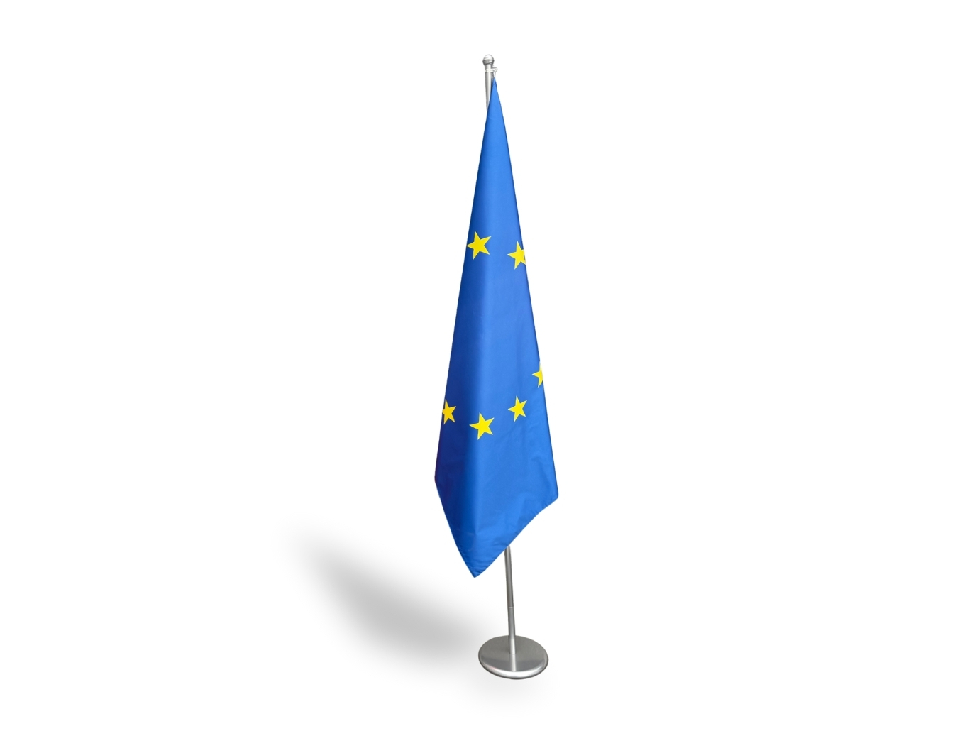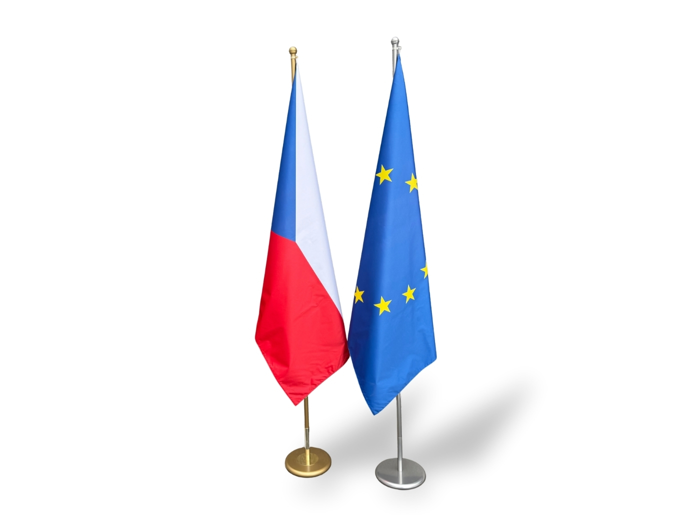 Kompletní interiérový set zahrnující kovový stojan s žerdí a interiérovou tištěnou vlajku České republiky nebo Evropské unie, určený pro důstojné vyvěšení v oficiálních interiérech.