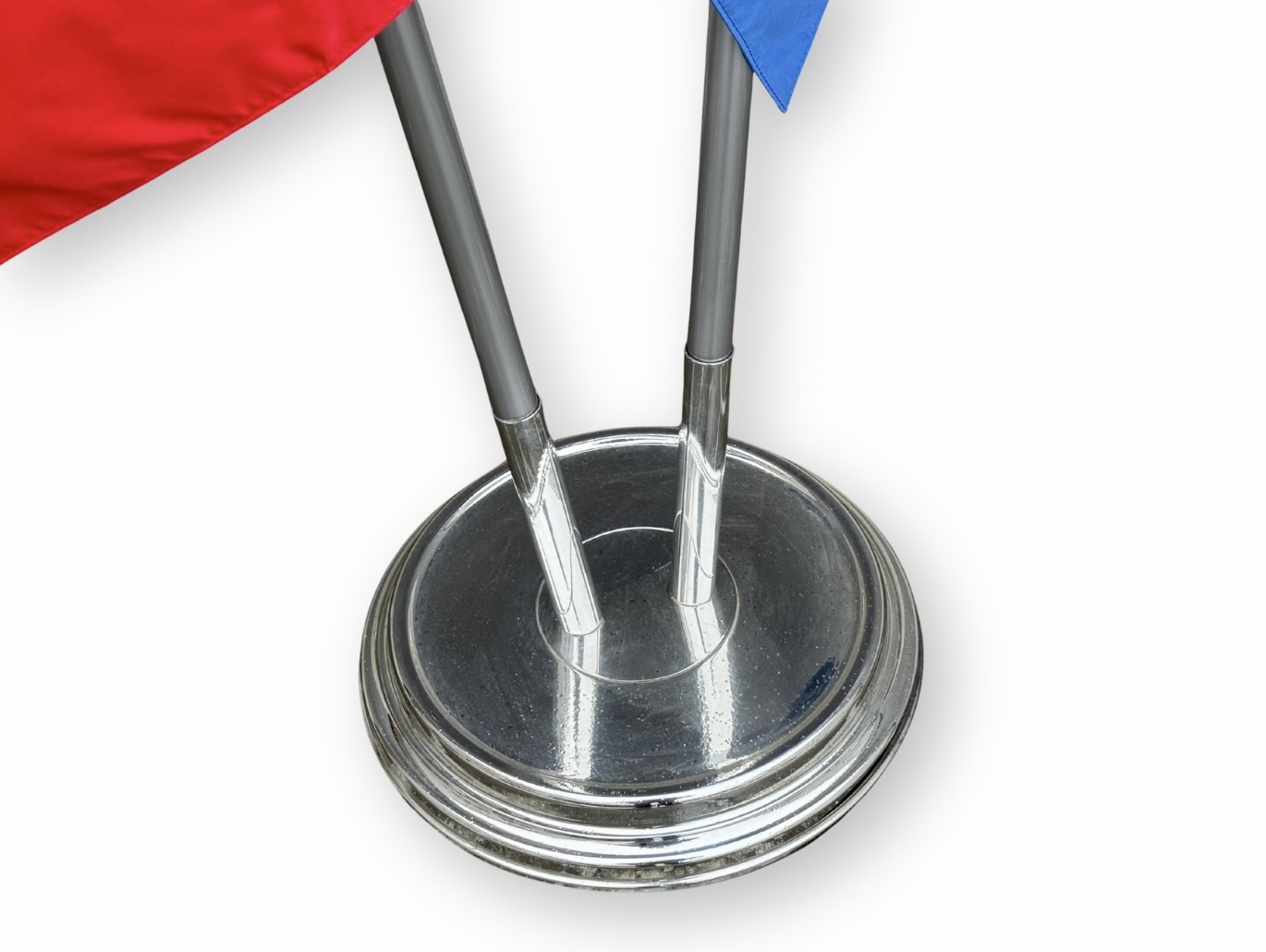 Lakovaný kovový interiérový dvojstojan s žerděmi a kruhovou podstavou o průměru 35 cm je určen pro současné vyvěšení dvou vlajek v reprezentačních interiérech.
