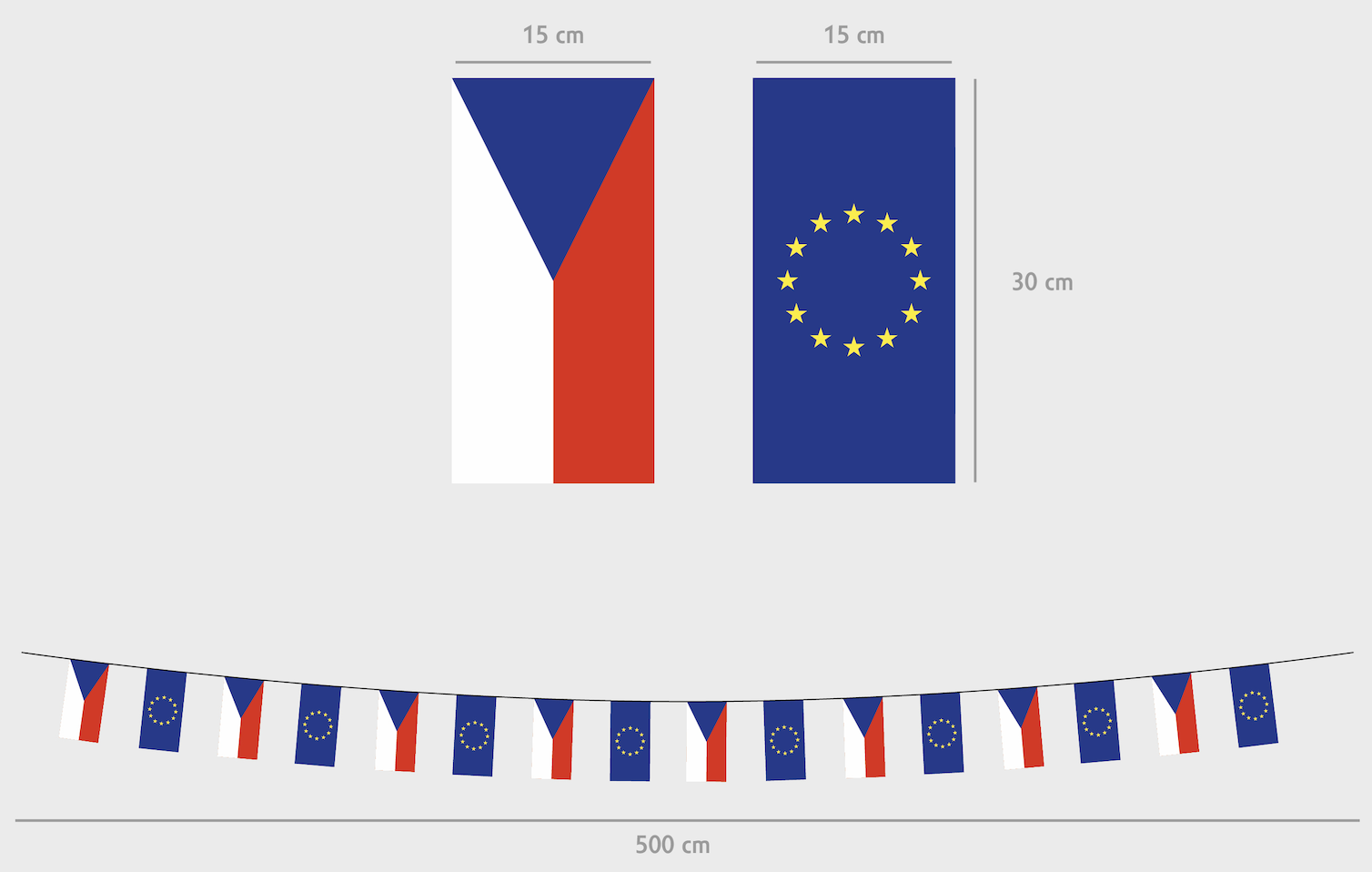 Provazec s českými a evropskými praporky se střídavým řazením o celkové délce 5 metrů. Ideální výzdoba pro vnitřní i venkovní prostory při slavnostních příležitostech, volbách nebo oficiálních setkáních.