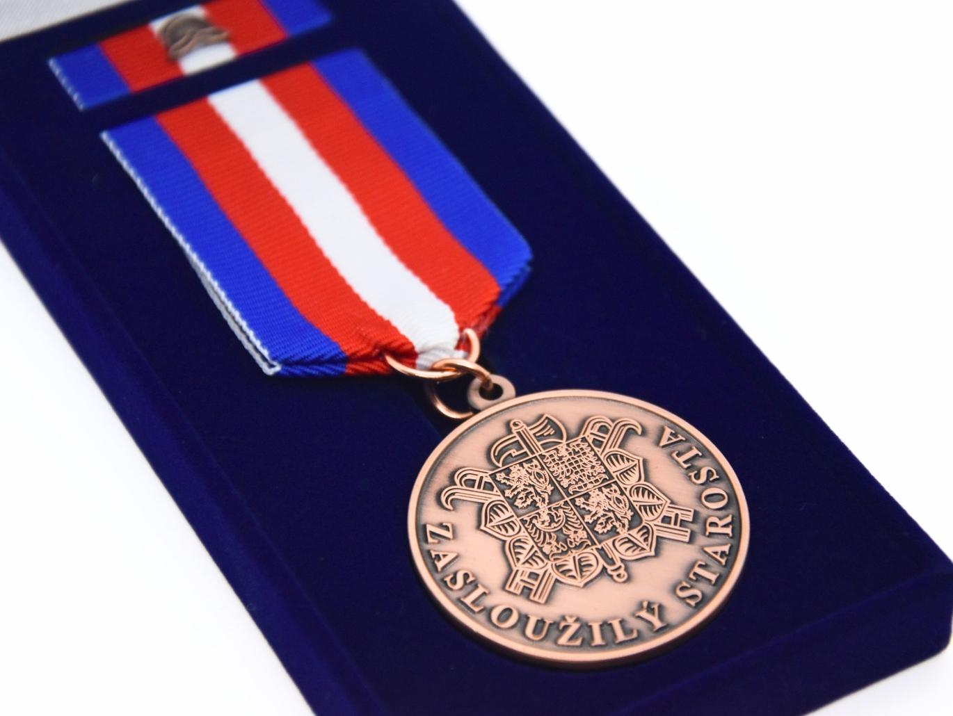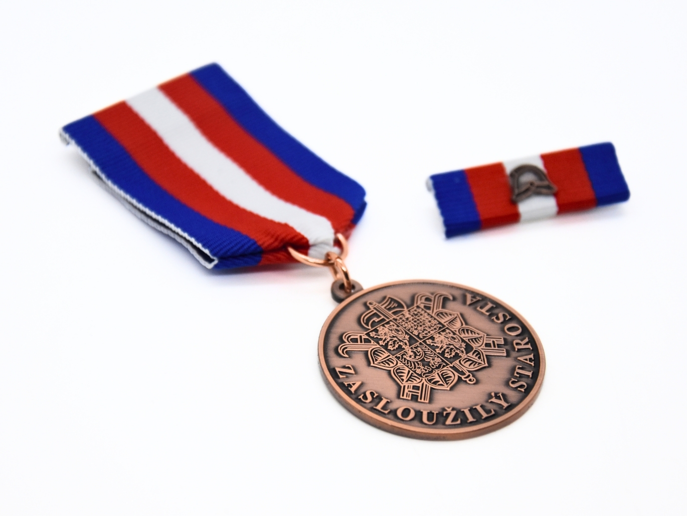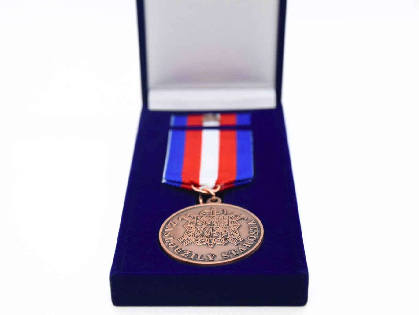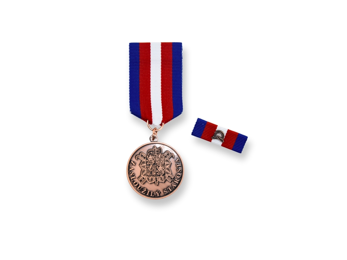 Reprezentativní bronzová záslužná medaile určená starostům hasičských sborů. Motiv tvoří státní znak zasazený do hasičské symboliky se zkříženými žebříky, sekerkou a lipovými listy a doplňuje ho stuha v barvách české trikolory.